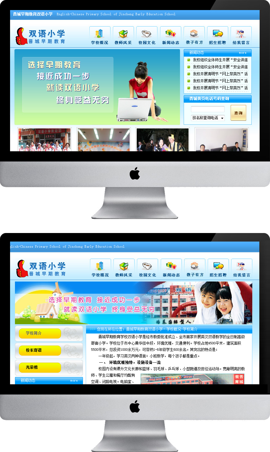 晉城早期教育學(xué)校雙語(yǔ)小學(xué)是經(jīng)市教委批準(zhǔn)成立、全市首家開(kāi)展英漢雙語(yǔ)教學(xué)的全日制高級(jí)寄宿小學(xué)。學(xué)校位于市中心黃華街中段,環(huán)境優(yōu)雅,交通便利。學(xué)校占地4500平米,建筑面積5500平米,總投資1000余萬(wàn)元,可容納1-6年級(jí)學(xué)生600余名。其突出的特點(diǎn)是: