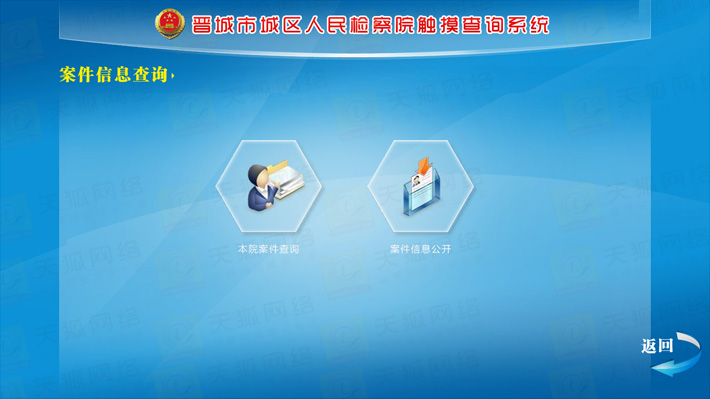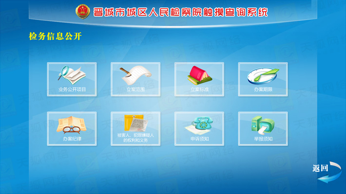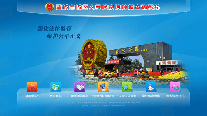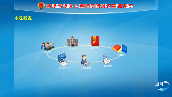 城區(qū)檢察院觸摸查詢系統(tǒng)分為前臺顯示模塊,動畫效果展示模塊,后臺資料更新維護(hù)模塊,外部設(shè)備I/O模塊等五大部分。