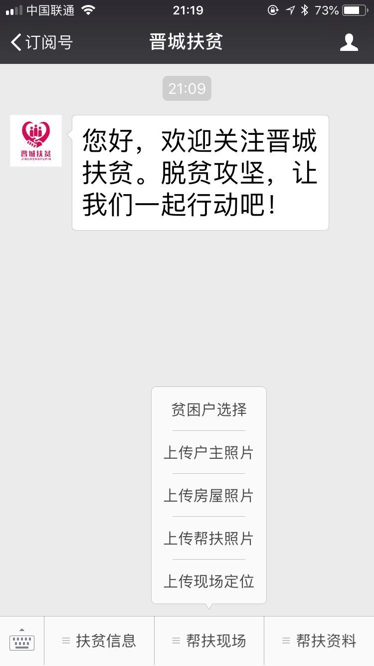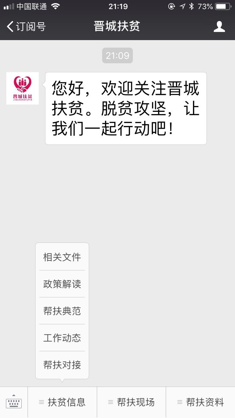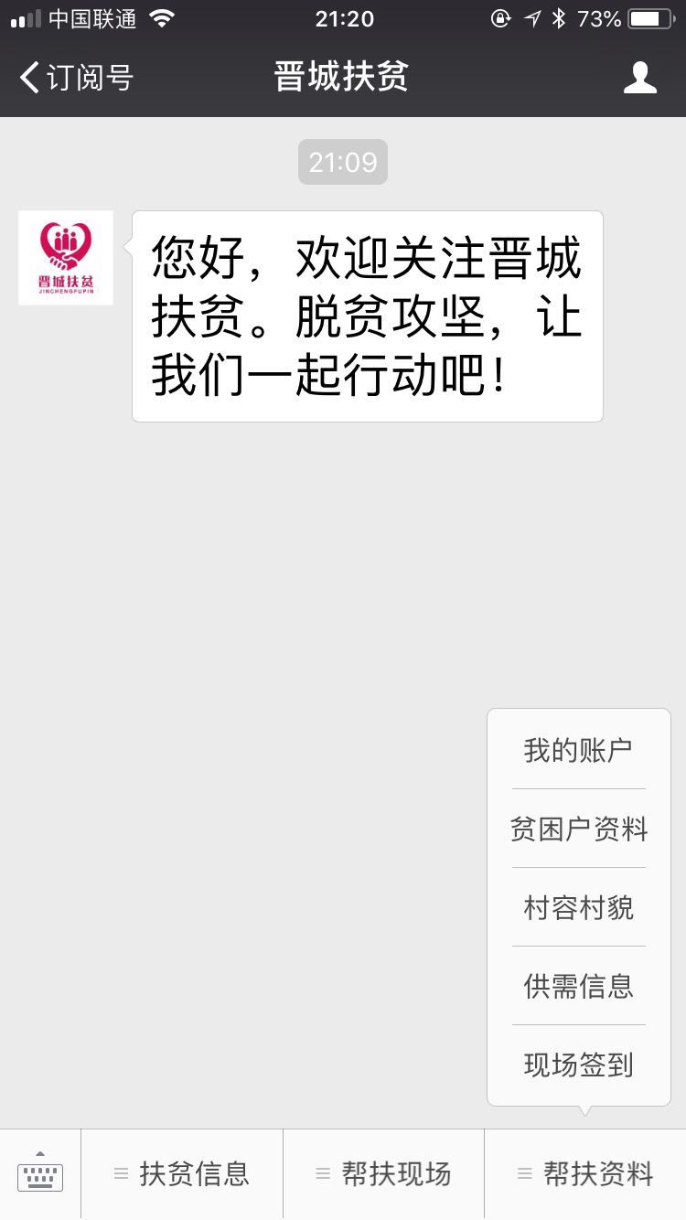 近日,“晉城扶貧”官方微信公眾號(微信號:sxjcfp)正式上線運(yùn)行,我公司承接了該公眾號擴(kuò)展功能的制作業(yè)務(wù)。