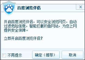 騰訊科技試用百度電腦管家之后稍許時間后,百度電腦管家自動彈出一個“建議安裝百度瀏覽伴侶”的提示,該界面顯示開啟百度瀏覽伴侶,可以安全瀏覽網(wǎng)頁,自動過濾危險信息,智能攔截釣魚網(wǎng)站。