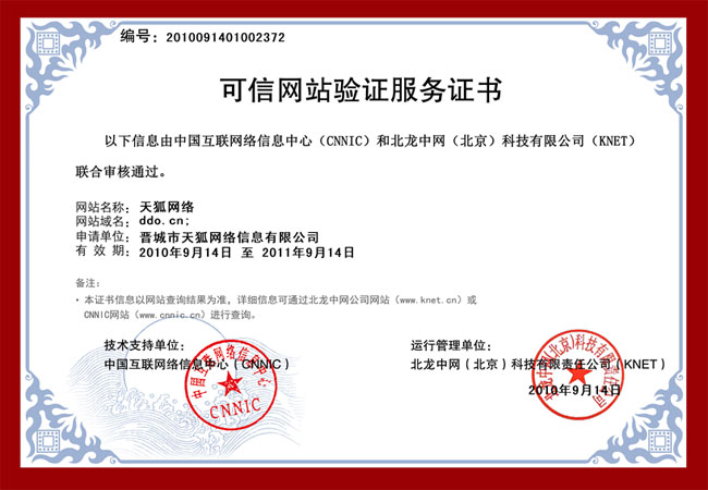 作為晉城本地專業(yè)的網(wǎng)絡(luò)公司,天狐網(wǎng)絡(luò)始終堅(jiān)持為客戶提供合法正規(guī)的網(wǎng)站建設(shè)服務(wù),為樹(shù)立天狐網(wǎng)絡(luò)全新可信的品牌形象,近日天狐網(wǎng)絡(luò)正式通過(guò)了第三方權(quán)威機(jī)構(gòu)實(shí)施的“可信網(wǎng)站”驗(yàn)證升級(jí)。