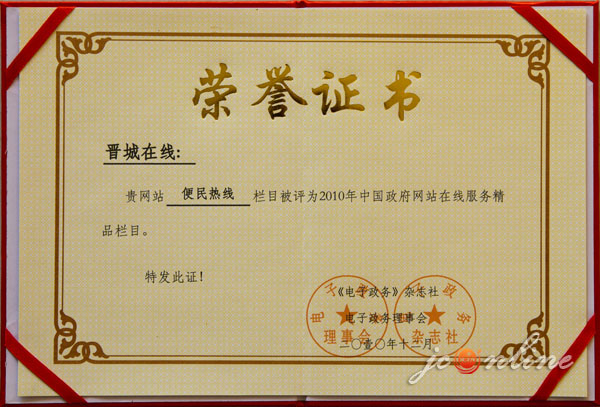 近年來,“晉城在線”已成為山西省內(nèi)外知名的信息站點,先后獲得了“中國城市門戶網(wǎng)站十大公信品牌”、“2008年中國政府門戶網(wǎng)站優(yōu)秀獎”、“2009年中國政府門戶網(wǎng)站優(yōu)秀獎”、“中國優(yōu)秀誠信品牌”、““2008年中國政府門戶網(wǎng)站信息公開領(lǐng)先獎”、“全國地方門戶網(wǎng)站十佳品牌”、“全國地方網(wǎng)站最具創(chuàng)新發(fā)展?jié)摿ζ放啤、?010年中國政府網(wǎng)站領(lǐng)先獎”等諸多榮譽稱號。